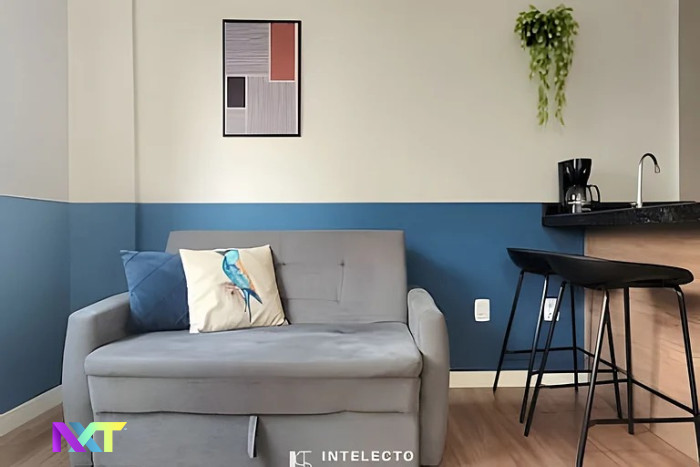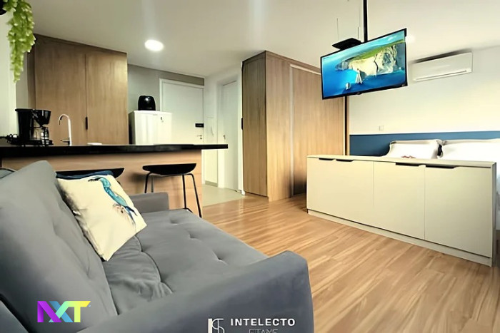 - Espaços integrados (quarto com cama queen e sala de estar com sofá-cama) com armários e guarda-roupas planejados