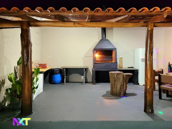 - Área de lazer com piscina, espreguiçadeiras, ducha, churrasqueira a carvão, mesas, cadeiras e geladeira