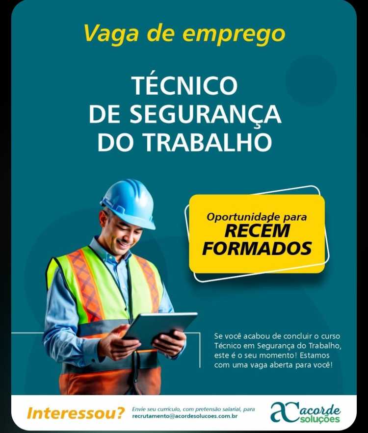 - Oportunidade para Recém-Formados no curso Técnico em Segurança do Trabalho.