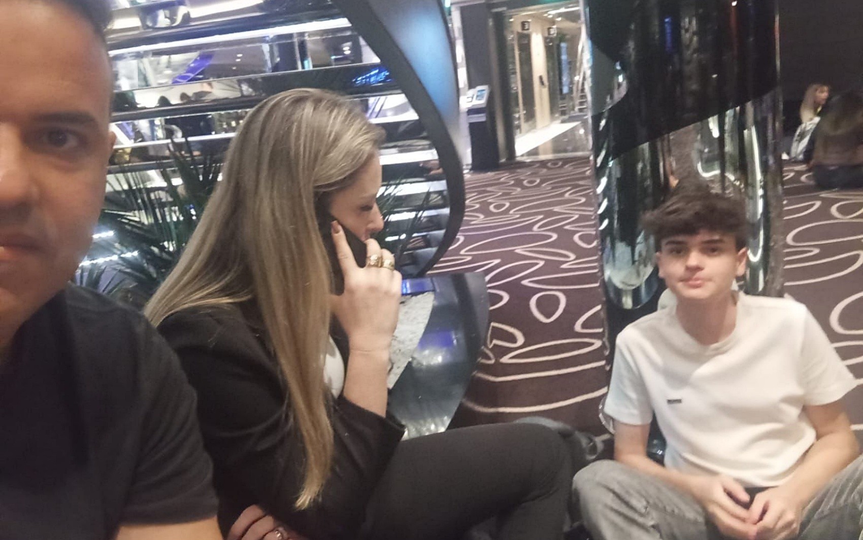 Ana Paula de Oliveira Graciani, o marido Carlos Eduardo da Silva e o filho Otávio Graciani da Silva aguardam orientações na recepção do navio, após descerem com os passaportes durante alerta de possível ataque em Dubai